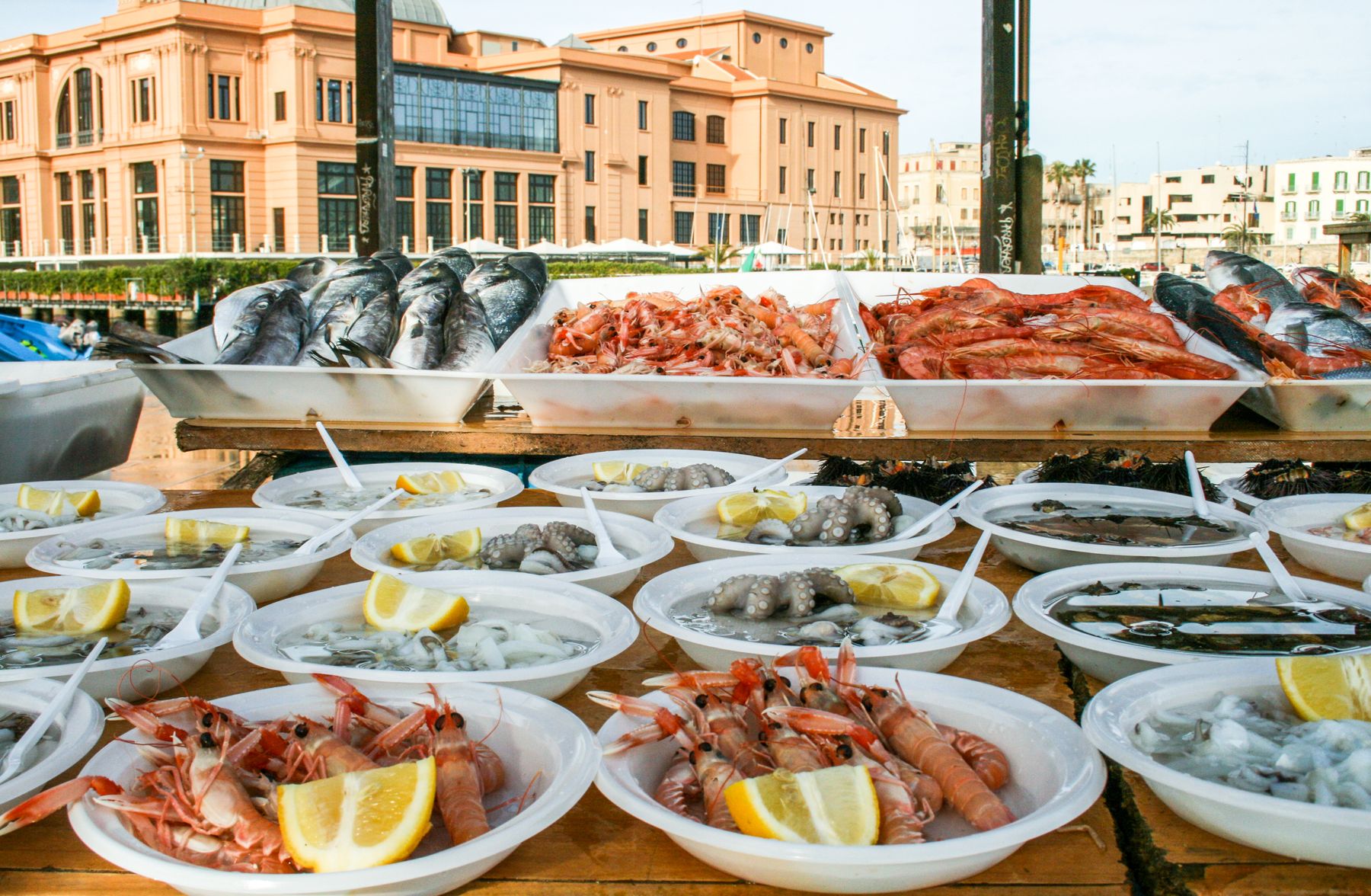 In timpul pranzului, pescarii se intorc de pe mare si aduc bunatati proaspete. Isi pun mesele pe tarm (Lungomare) si incing gratarele. Vei avea parte de cele mai bune scoici, de calamari, creveti, caracatita si peste divin. Portiile costa in jur de 5 euro, iar din apropiere poti cumpara bere italiana rece.